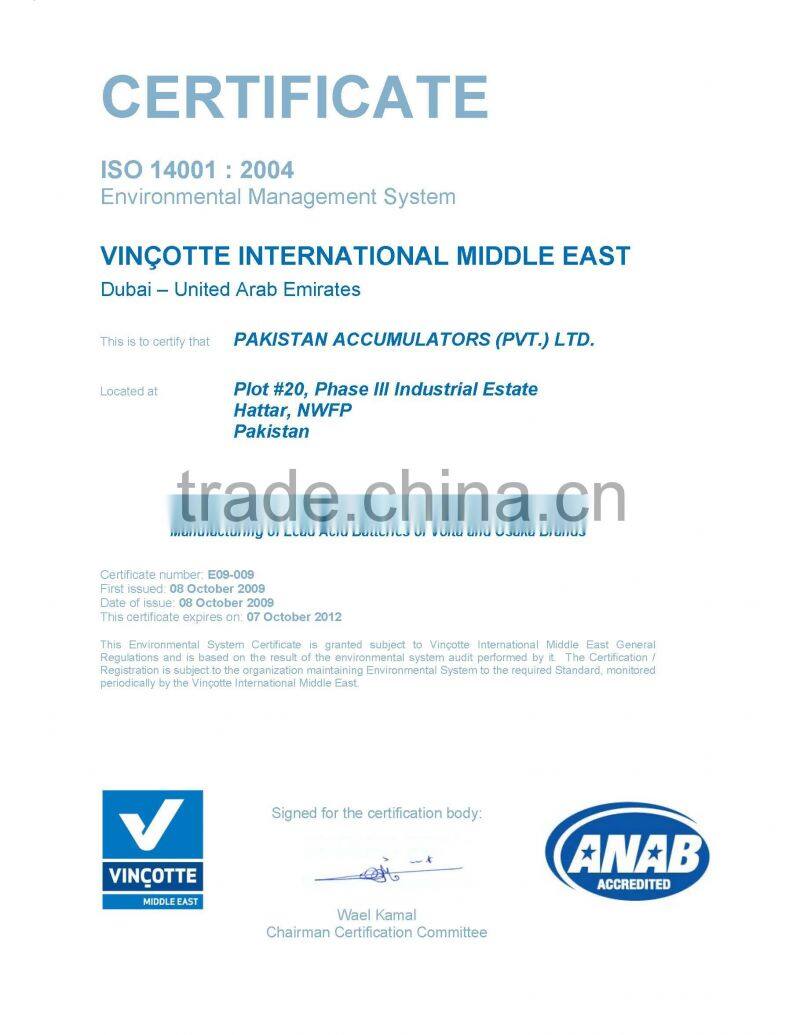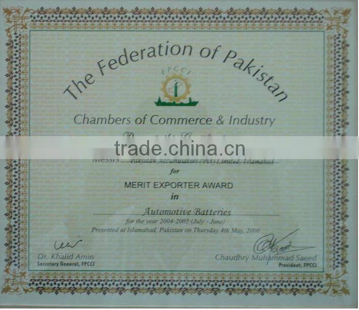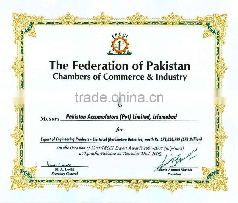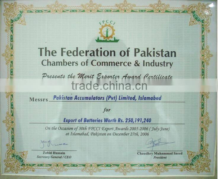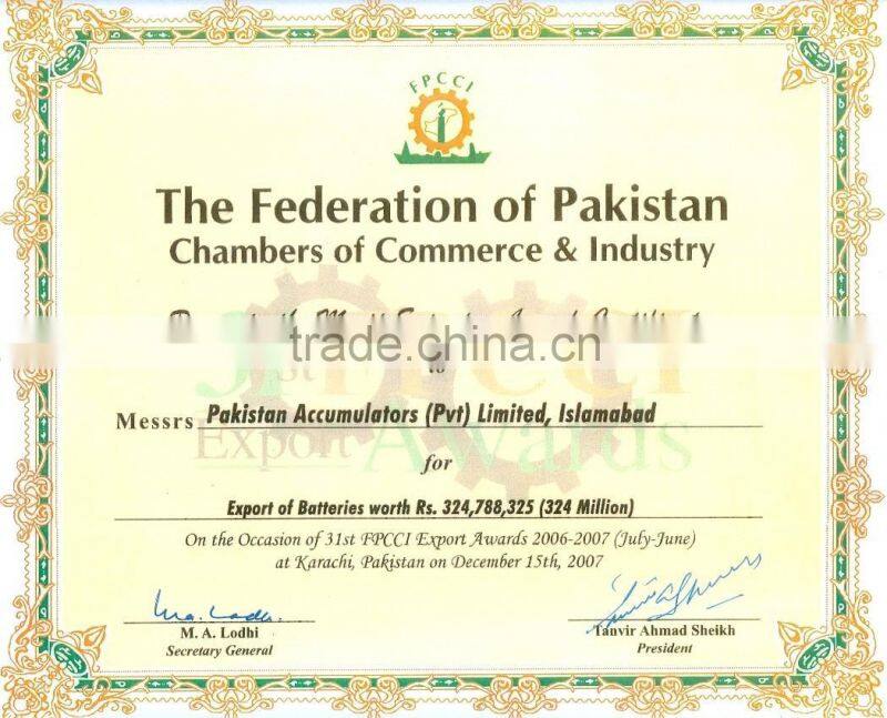 Our ISO 9001 & ISO 14001 certified manufacturing facility is equipped with the state of the art machinery and testing labs under the supervision of highly technical, experienced and skilled professionals to ensure optimum quality of our product. It is appropriate to mention here that we have been awarded "Exports Award' by Federation of Pakistan chamber of commerce and Industry (FPCCI) from the last 10 consecutive years for best exporter of Automotive Batteries in Pakistan. We also have the Facility to make Customized Brands (Private Label) for our valued customers.
